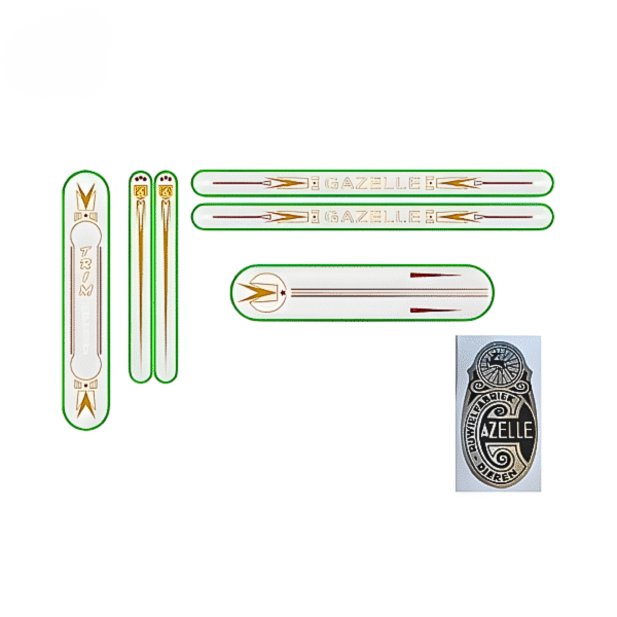 Conjunto adesivo inspirado nas séries Gazelle Trim Sport com traços longos e filetes paralelos que valorizam tubos e garfo. Vinil automotivo de alta aderência com impressão nítida e proteção UV. Produção Flaus Bicycle para restauração fiel e acabamento de coleção.