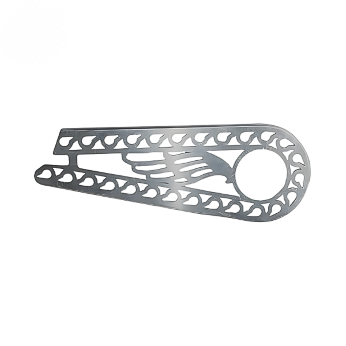 Cobre corrente inspirado nos modelos Hermes das décadas de 1930 e 1940, com fiações finas e recortes decorativos que remetem à estética art déco. A trama vazada permite ventilação da corrente e menor acúmulo de sujeira, além de destacar o visual do conjunto. Uma opção elegante para quem restaura bicicletas antigas e quer manter autenticidade com toque estético refinado. Compatível com quadros que admitam capa de corrente vazada.
