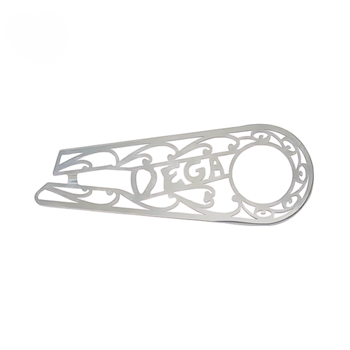 Proteção decorativa para corrente com padrão “Vega”, combinando recortes artísticos e estrutura funcional. Esse design clássico oferece ventilação eficaz e visual sofisticado. Ideal para bicicletas restauradas com traços artísticos da década de 30 ou 40.
