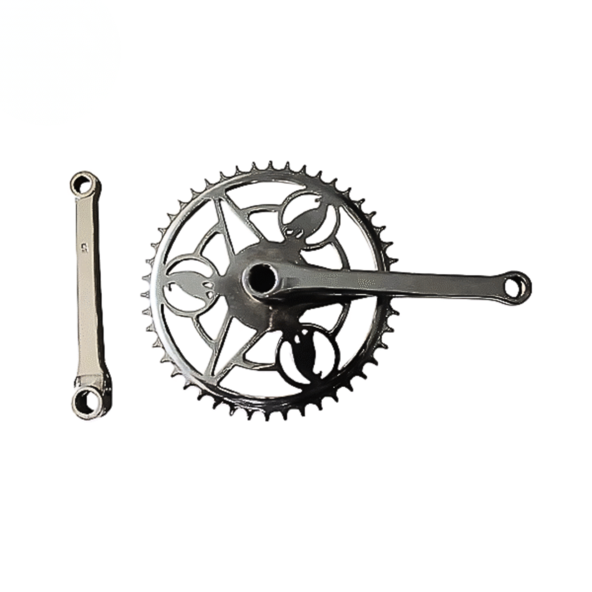 Coroa com pé de velas Covente inglesa 46 dentes, com recortes equilibrados e acabamento retrô. Um clássico britânico que une autenticidade e charme histórico em bicicletas restauradas.