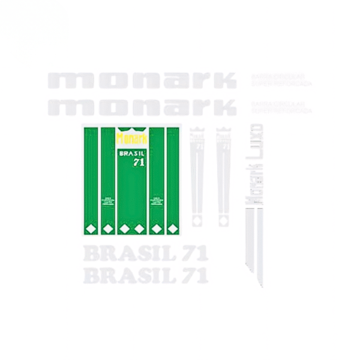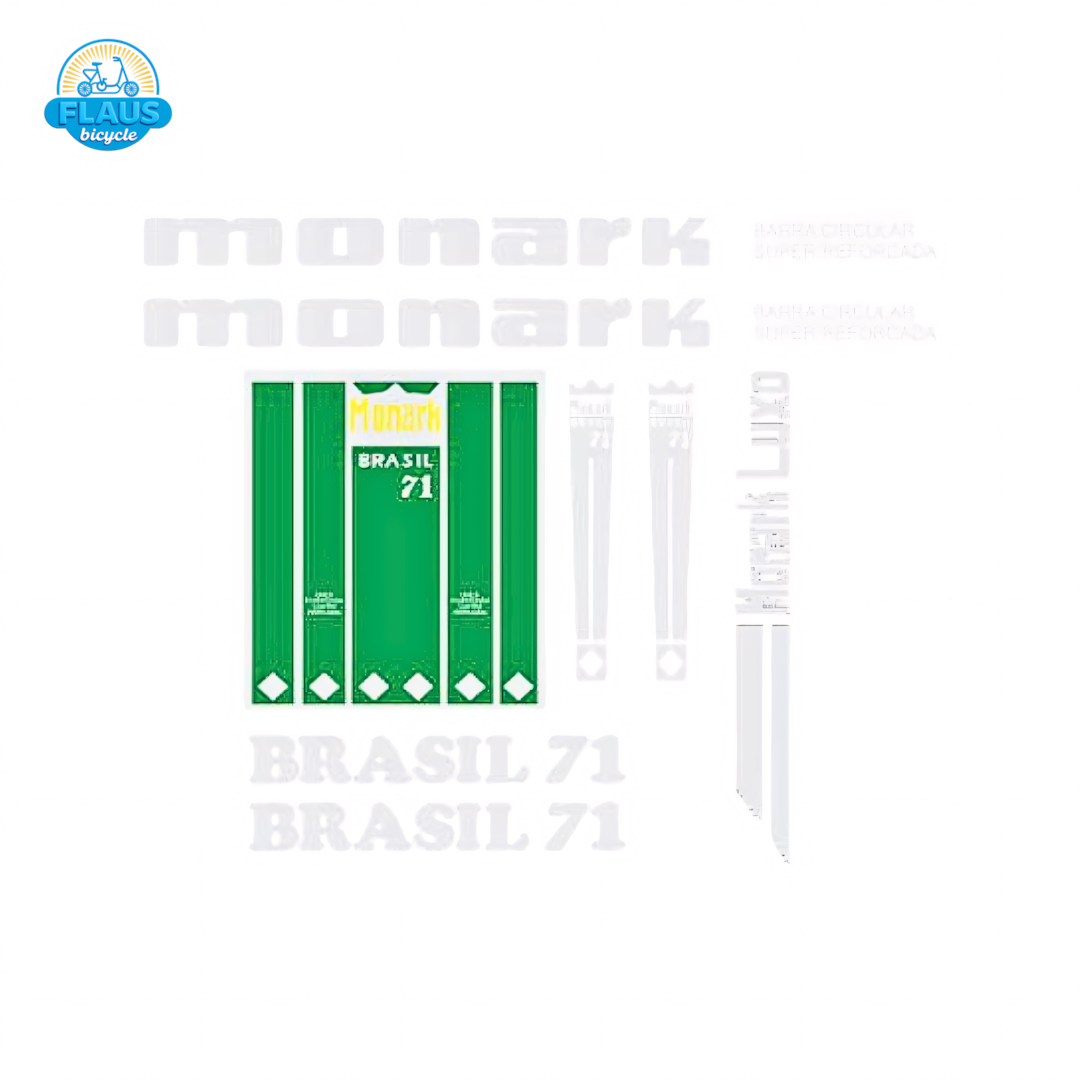 Decalques desenvolvidos a partir de referências originais Monark 1971. Impressão resistente e cores autênticas preservadas para restaurações fiéis ao modelo de época. Produção Flaus Bicycle com acabamento de excelência.