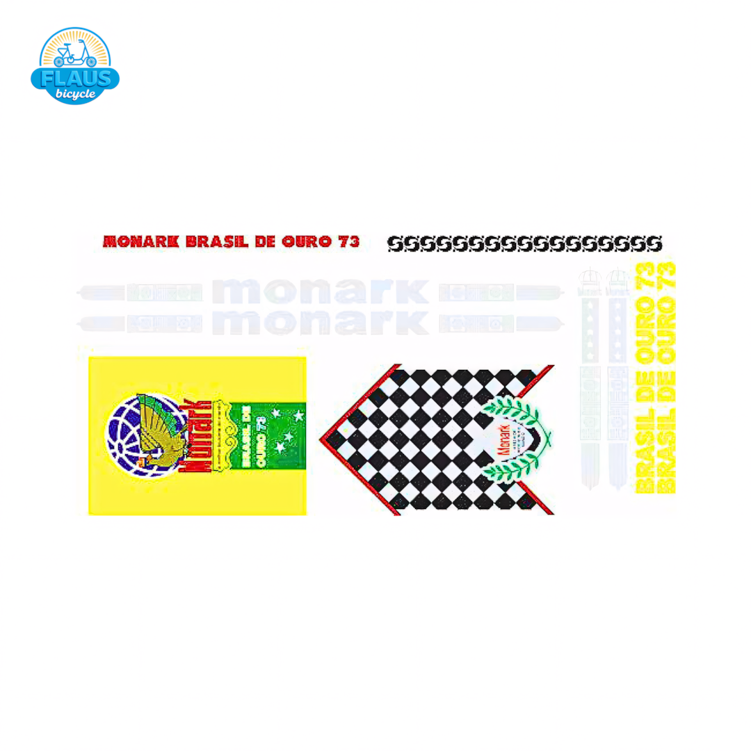 Reprodução detalhada da série Monark Brasil de Ouro 1973, aros 26/28 com impressão precisa cores vibrantes e verniz protetor. Produção Flaus Bicycle ideal para restaurações completas com fidelidade estética e técnica.