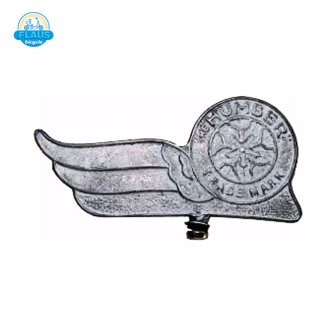 Emblema Humber Inglesa com asas laterais e brasão central. Reproduzido com fidelidade pela Flaus Bicycle, destacando-se pelo acabamento detalhado e encaixe compatível com bicicletas inglesas antigas.