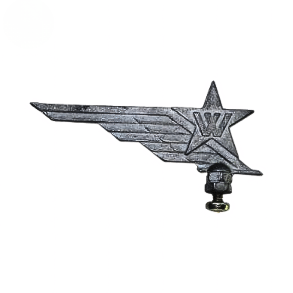 Emblema Sueca com asas marcantes e acabamento polido, símbolo de elegância das bicicletas clássicas.