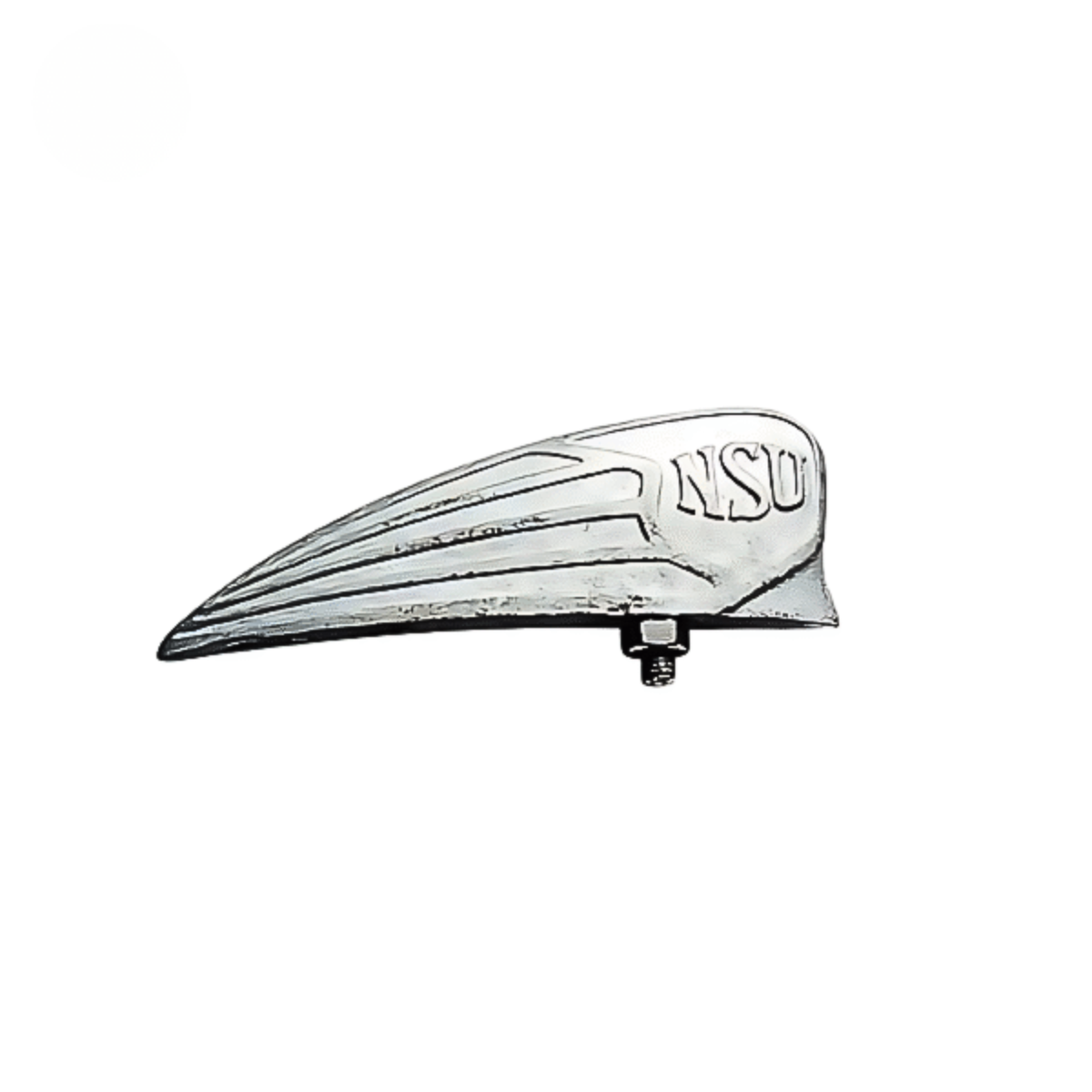 Enfeite NSU com linhas aerodinâmicas e acabamento refinado. Detalhe elegante e histórico.