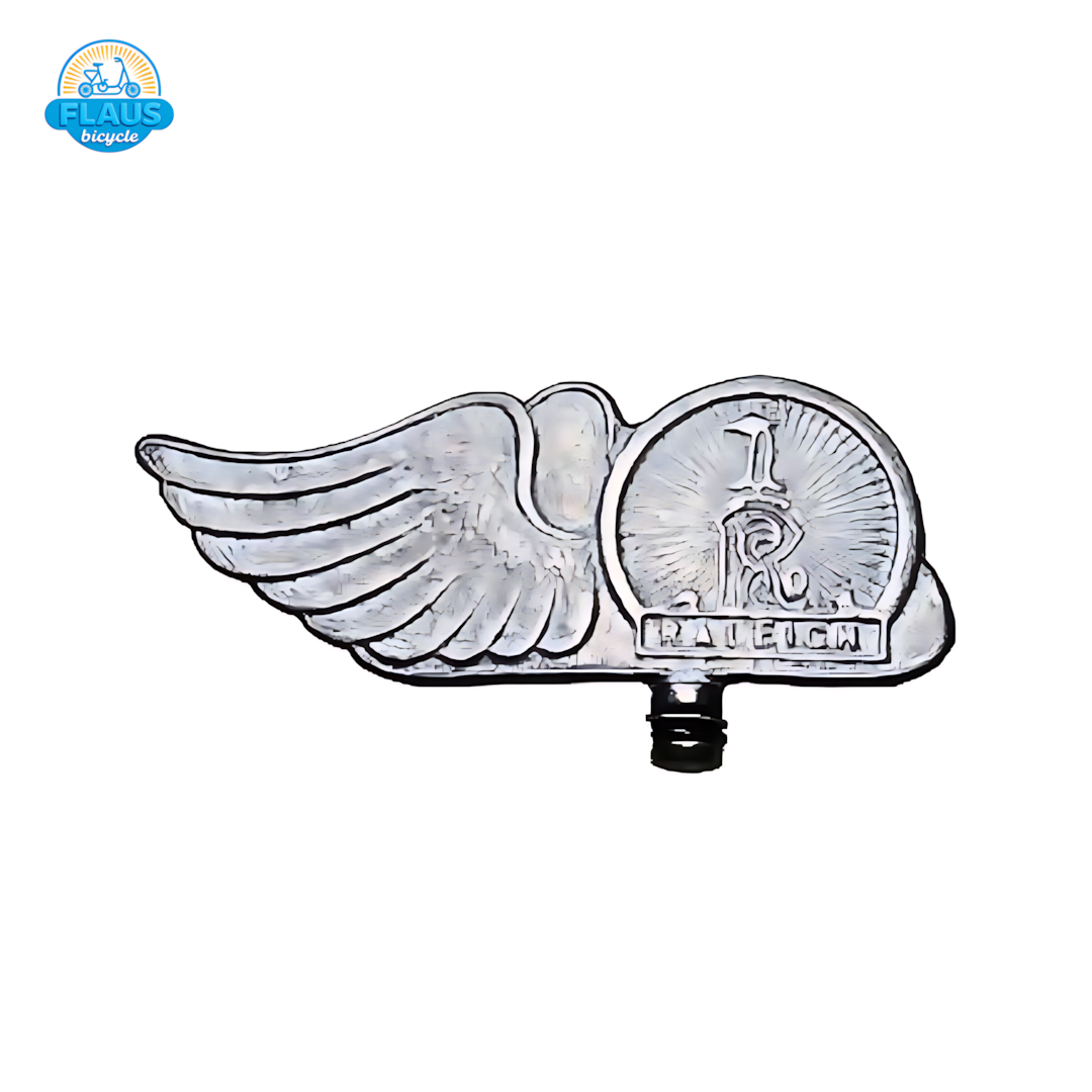 Enfeite Raleigh Inglesa para paralamas, com design de asas e logotipo central. Produção Flaus Bicycle com medidas fiéis e acabamento retrô que valoriza bicicletas históricas.