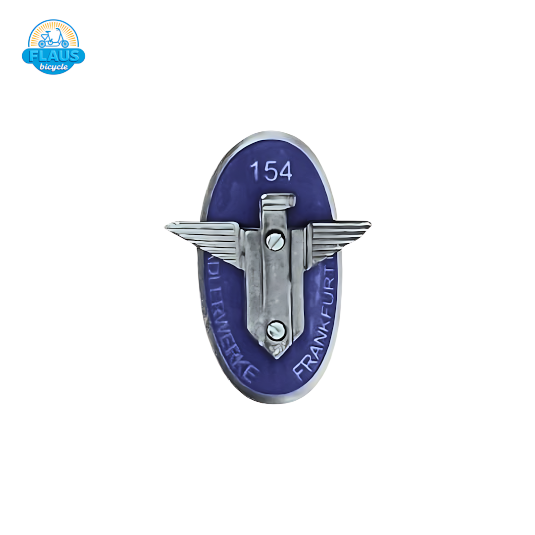 Plaqueta Adler Alemã para o lado esquerdo, com brasão alado e tonalidade azul de época. Furação dupla para montagem precisa e acabamento que reforça o design original de bicicletas alemãs clássicas.