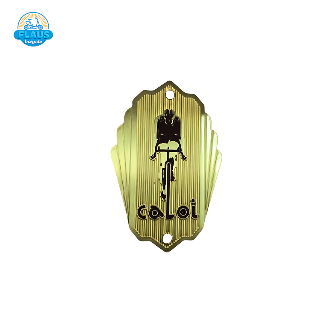 Plaqueta Caloi com brasão vertical e furação dupla para restaurações de época.