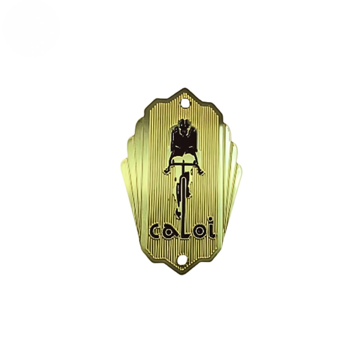 Plaqueta frontal Caloi com brasão vertical e ciclista em destaque. Design característico das séries nacionais clássicas, com furação dupla e encaixe curvo. Ideal para restaurações que valorizam a herança da marca brasileira.