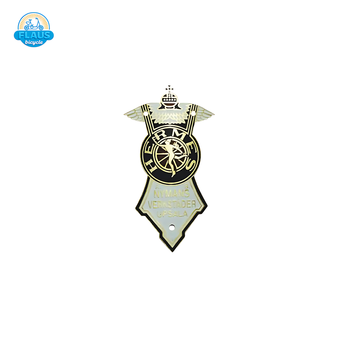 Plaqueta frontal Hermes Feminina com brasão náutico e elementos ornamentais verticais. Curvatura para encaixe preciso no tubo de direção, dupla furação e acabamento de época. Ideal para restaurar bicicletas com identidade clássica e presença visual refinada.