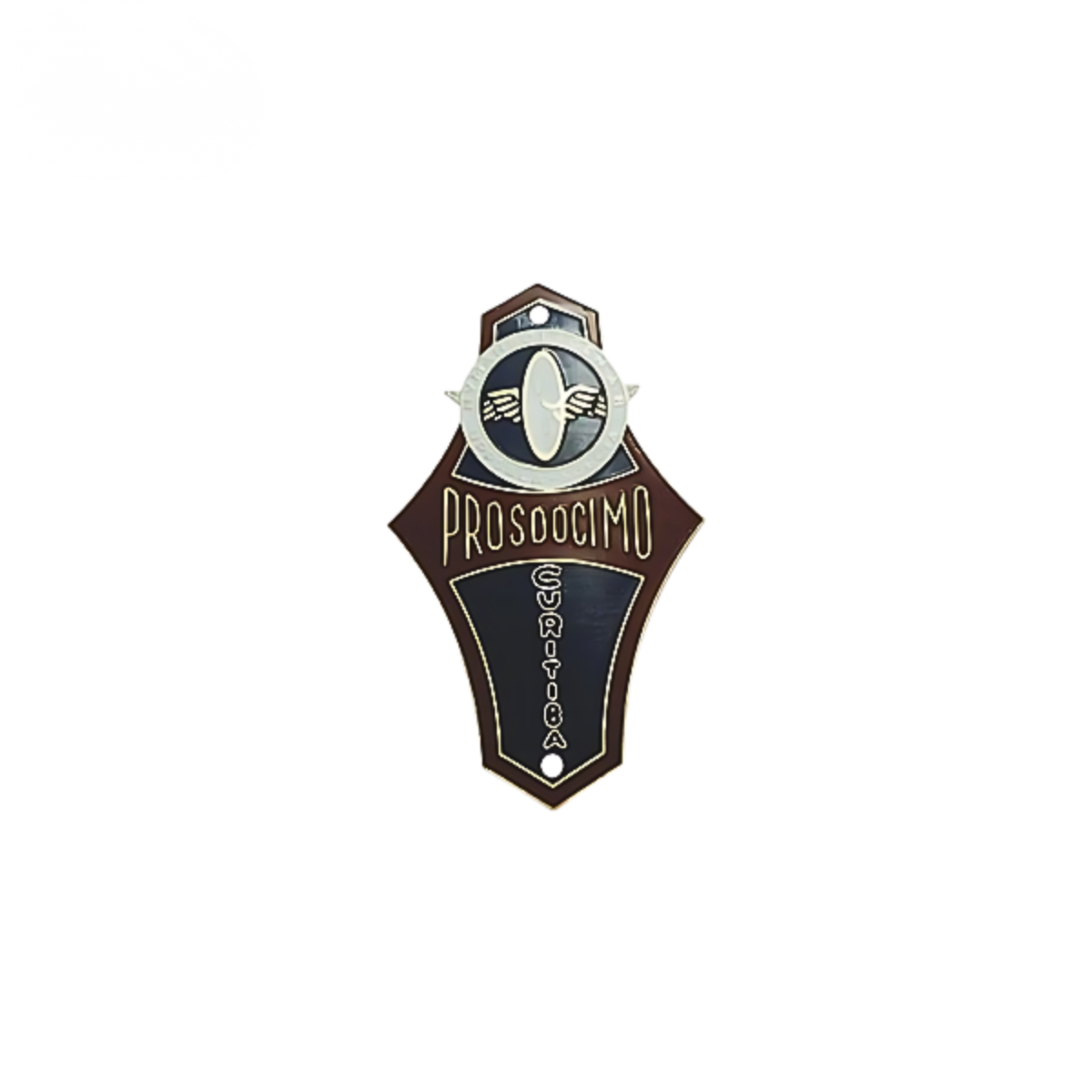 Plaqueta Identificação Prosdocimo com escudo alongado e furação dupla para montagem precisa.