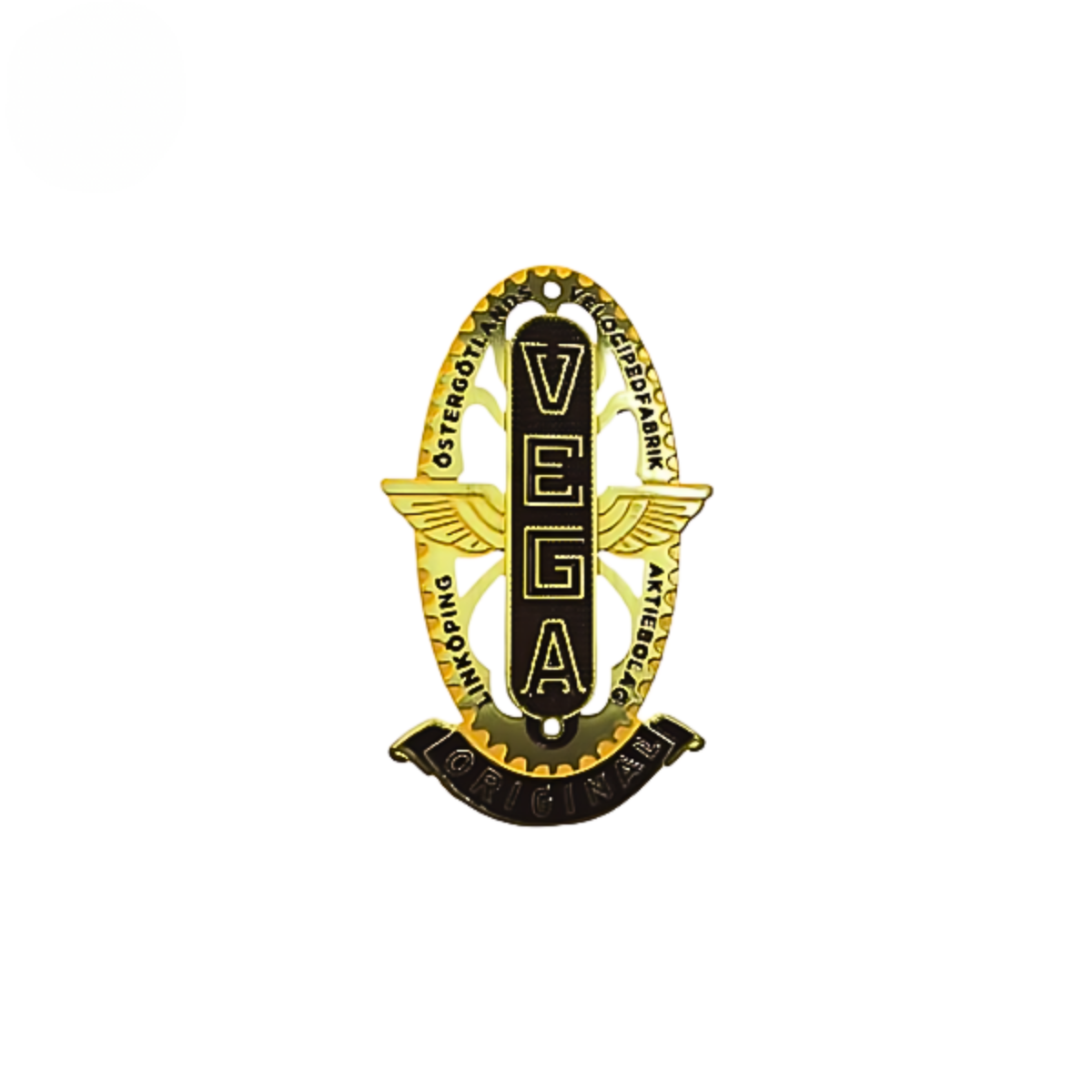 Plaqueta Vega com formato ovalado e brasão em relevo centralizado. Asas laterais estilizadas e inscrições de época reforçam o design refinado das bicicletas clássicas. Possui curvatura leve e furação dupla para instalação segura.