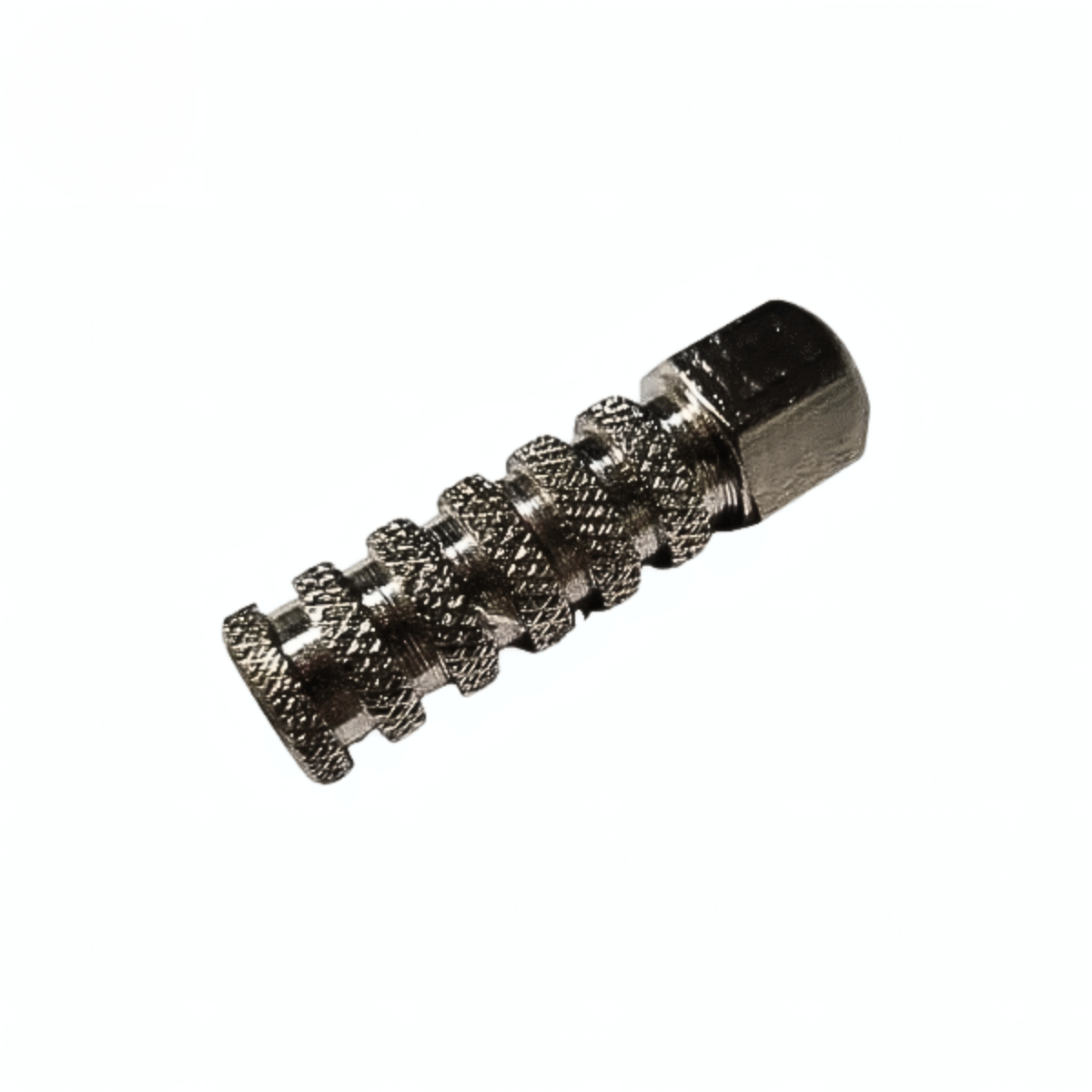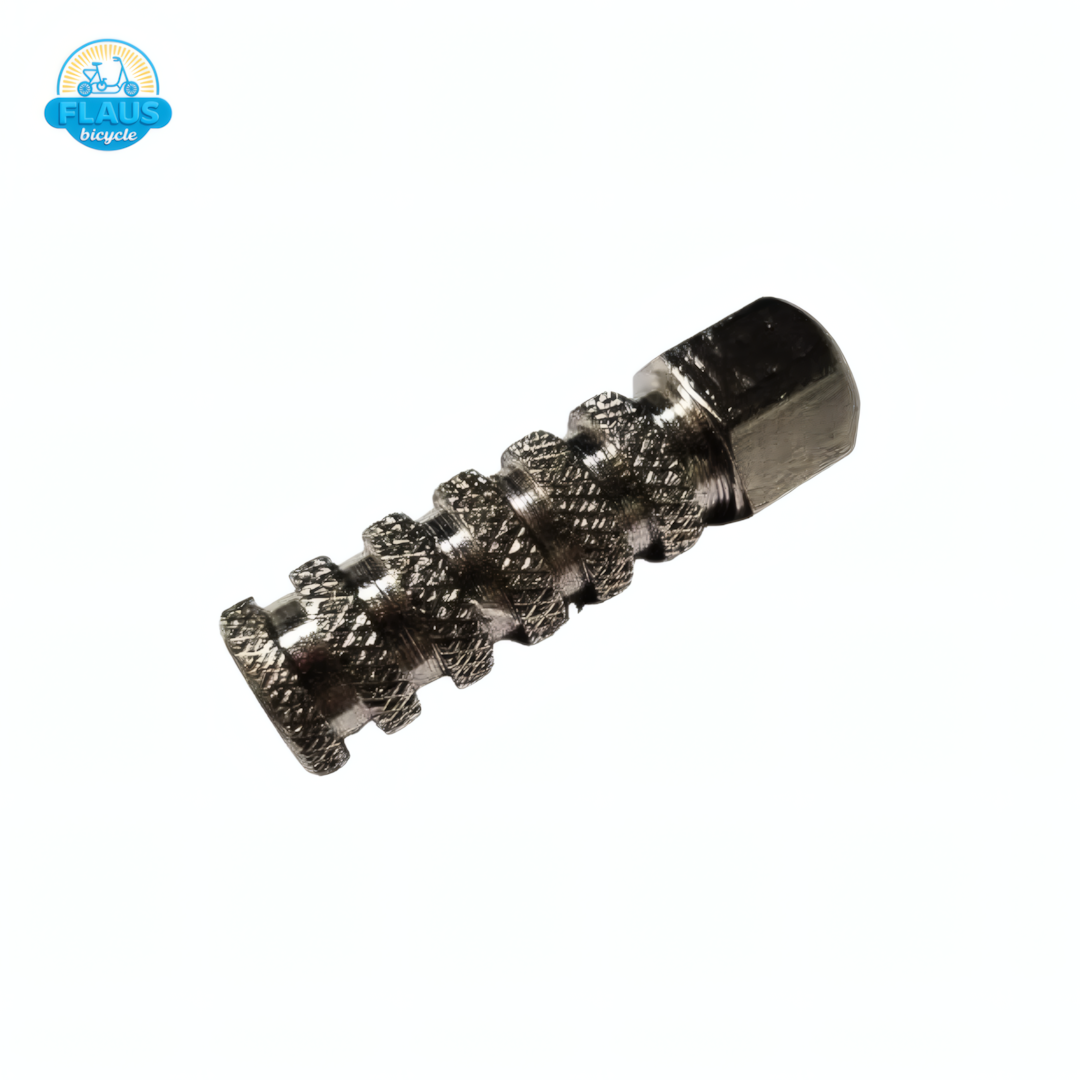 Corpo cilíndrico com ranhuras que facilitam o manejo manual e evocam peças presentes em bicicletas do final do século XIX e início do XX. Rosca precisa e base de apoio que protege o cubo. Produzida pela Flaus Bicycle com material reforçado e acabamento brilhante controlado.