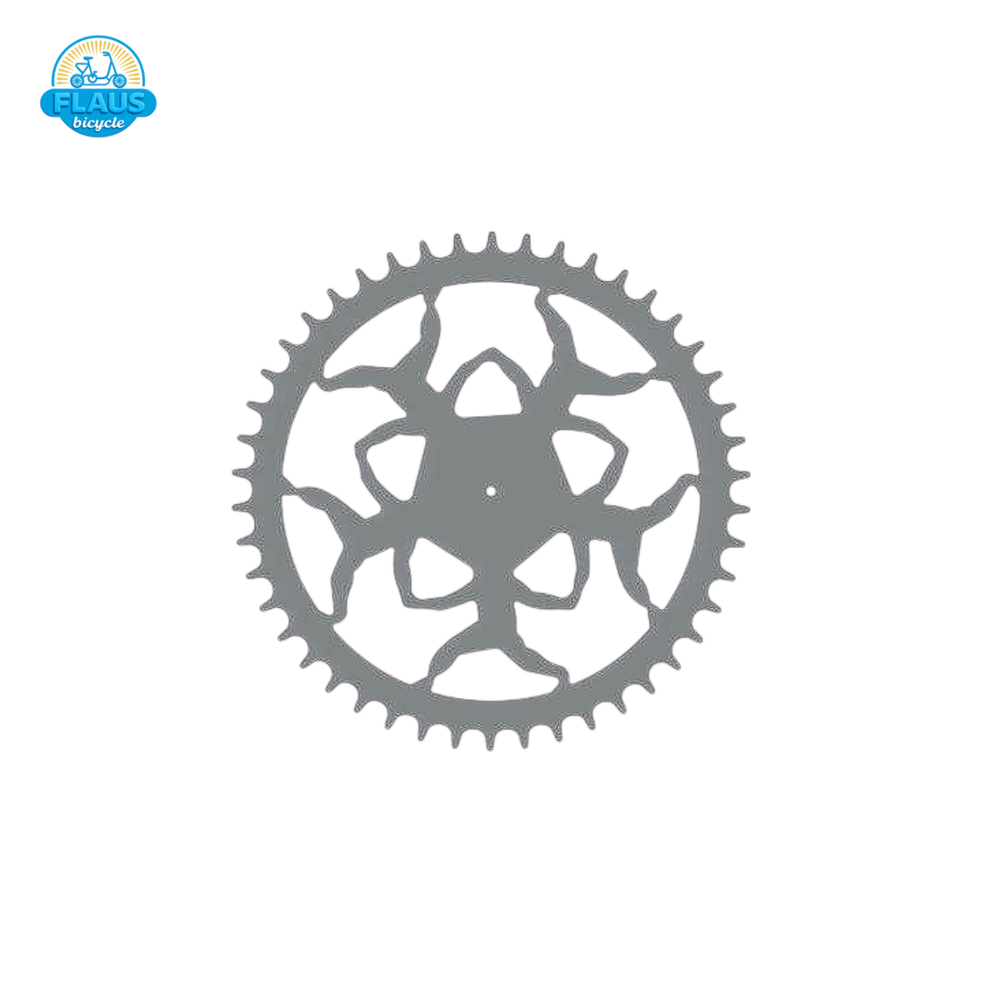 Coroa Humber inglesa com 46 dentes e design floral recortado. Símbolo das bicicletas inglesas de luxo, combina leveza estrutural e alta durabilidade, com acabamento polido de alto brilho e encaixe preciso.