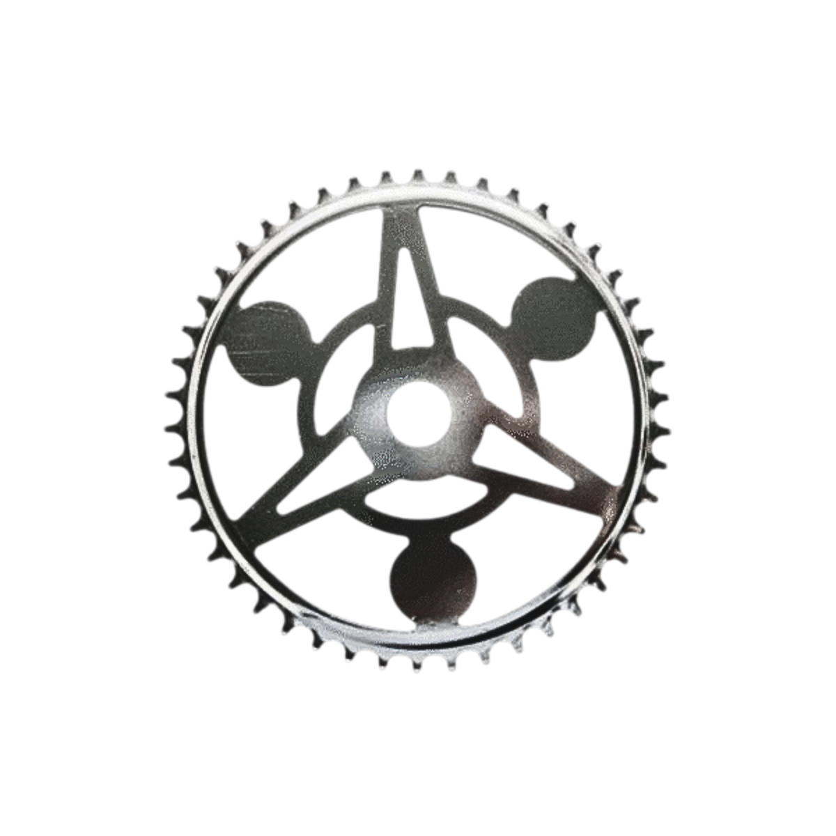 Coroa Mercswiss com 46 dentes, recorte de design alemão icônico e acabamento em aço espelhado. Modelo usado em bicicletas de coleção, ideal para projetos de reconstrução com padrão internacional.