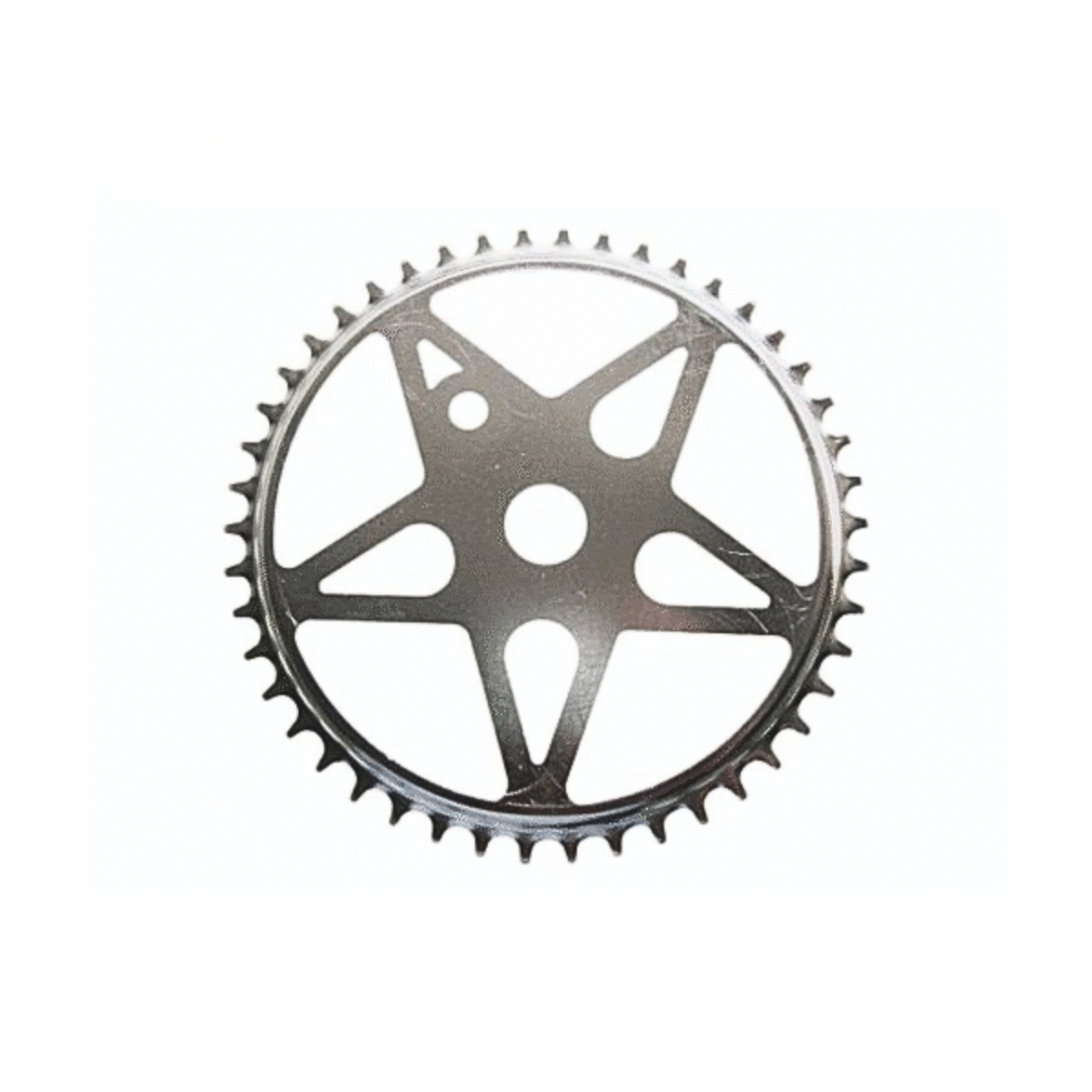 Coroa Monark 46 dentes para modelos até 1956. Produzida em aço resistente com padrão estrela central, mantém a estética original das bicicletas brasileiras de época.
