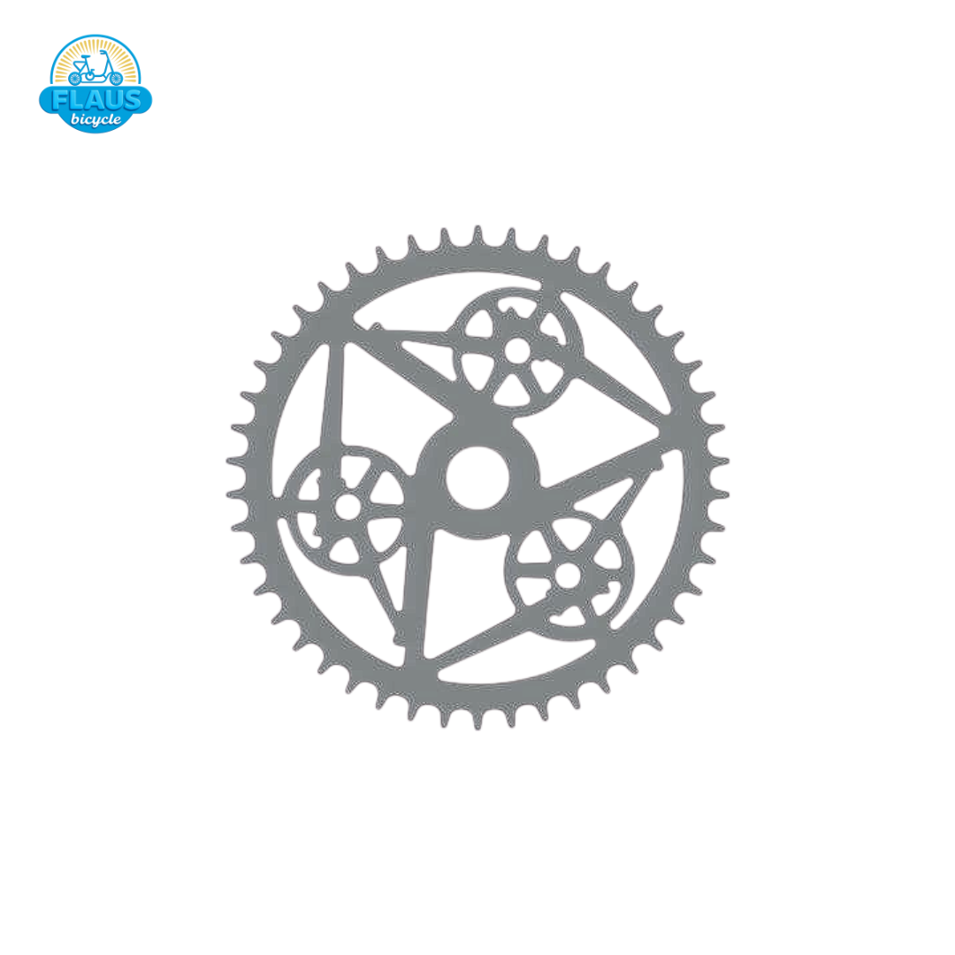 Coroa Royal Infild inglesa com 46 dentes e recortes geométricos inspirados no design vintage das motos clássicas. Fabricada em aço resistente com acabamento de alto brilho para autenticidade e durabilidade.