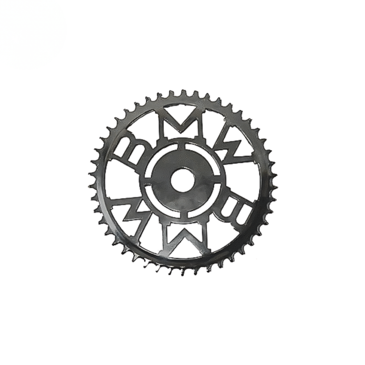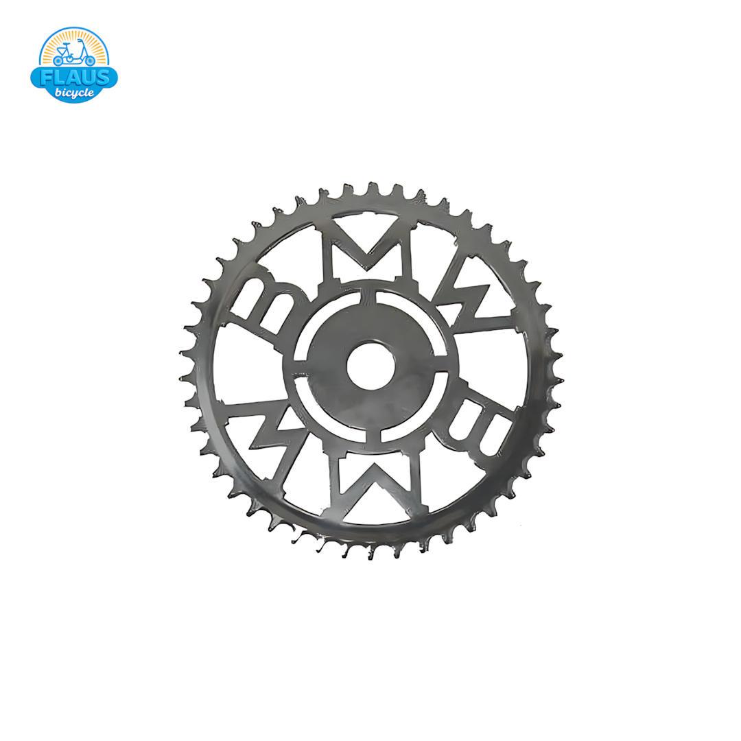 Coroa BMW 46 dentes, peça de design icônico com letras recortadas no corpo, reproduzida pela Flaus Bicycle com fidelidade e durabilidade superiores. Ideal para colecionadores e restauradores exigentes.