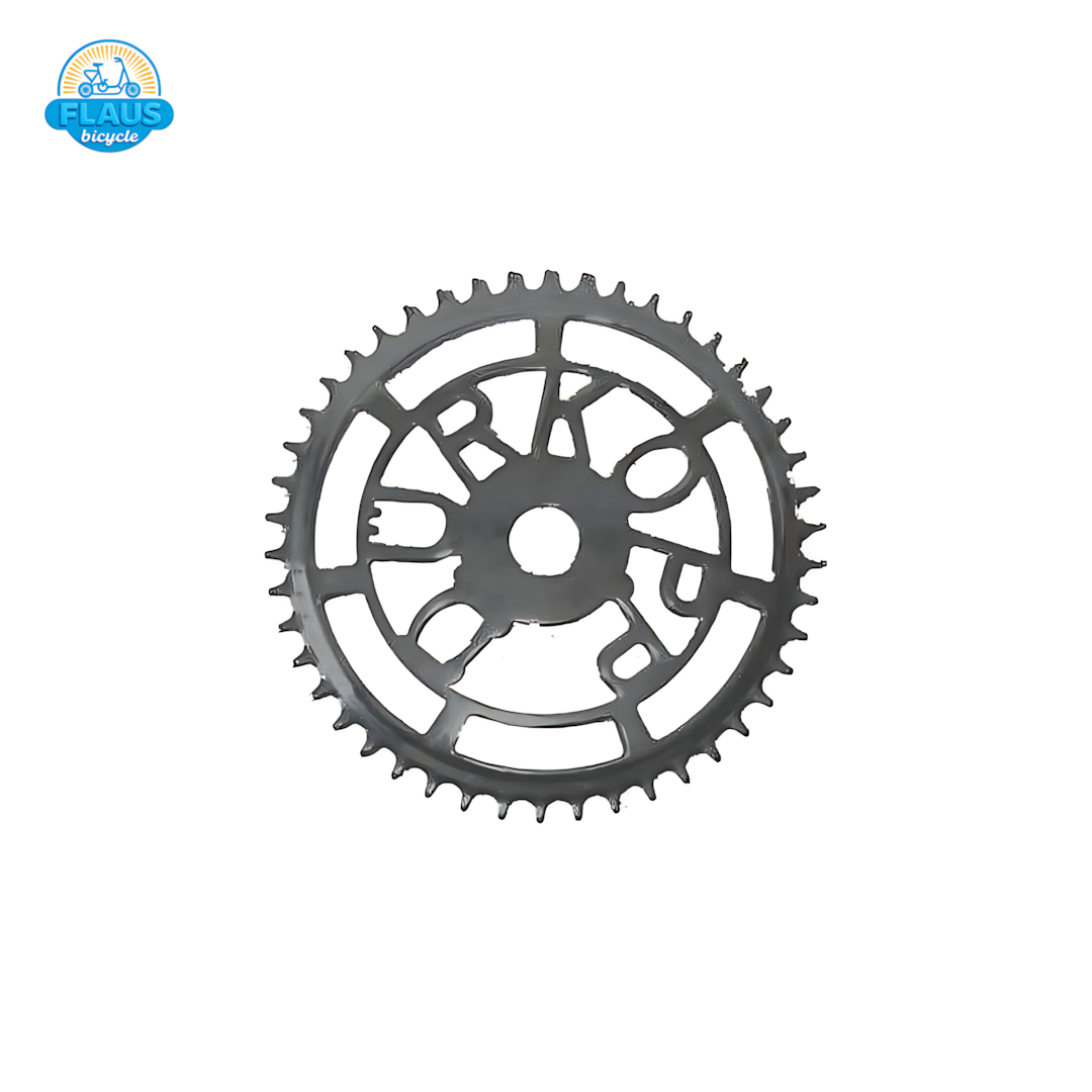 Coroa Durkopp 46 dentes, inspirada no modelo alemão clássico com recortes simétricos. Produzida pela Flaus Bicycle com encaixe padronizado e acabamento artesanal, ideal para restaurações de alto nível.