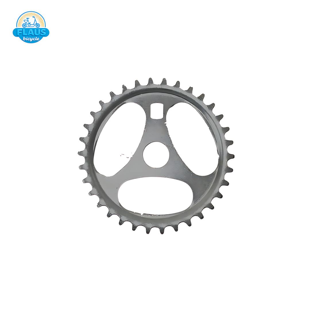 Coroa Monareta Mirim 34 dentes, modelo compacto desenvolvido para bicicletas infantis clássicas. Produzida pela Flaus Bicycle com encaixe preciso e proporções originais, ideal para restaurações que buscam fidelidade estética e funcionalidade leve.