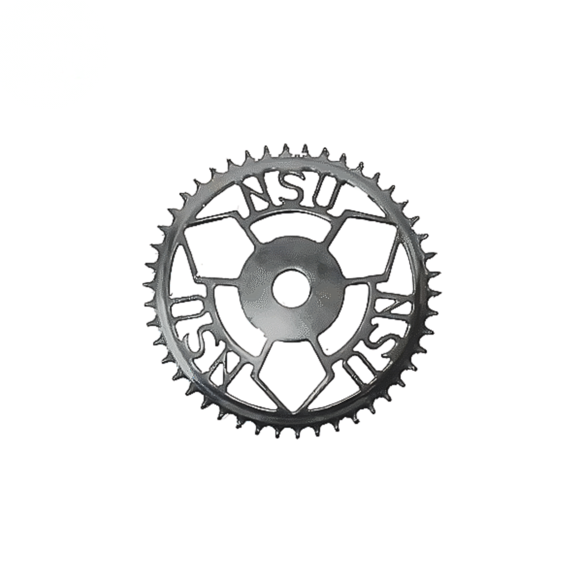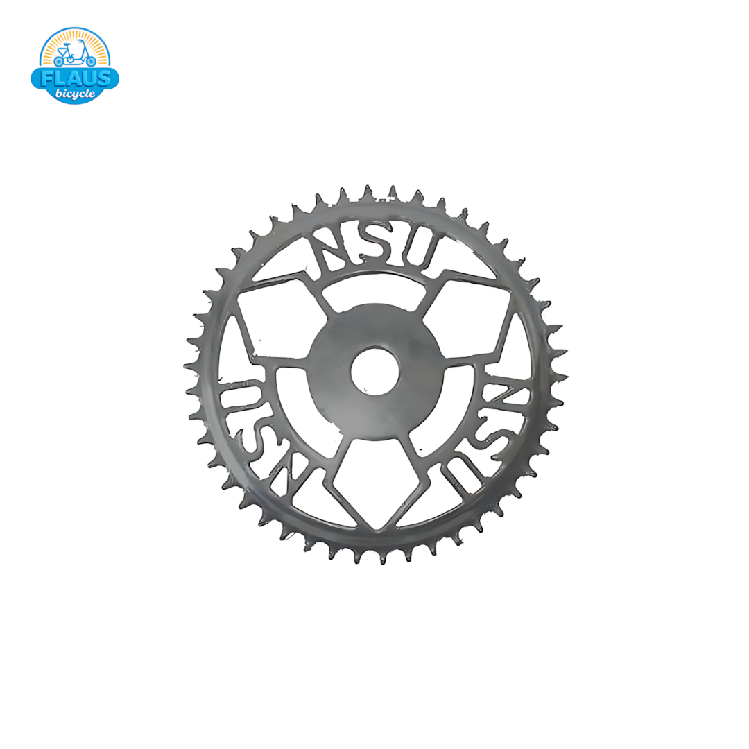 Coroa NSU 46 dentes com design clássico e letreiro recortado. Recriação feita pela Flaus Bicycle com medidas e furação compatíveis com padrões originais. Peça que combina estilo histórico e desempenho confiável, perfeita para restaurações de alto padrão.