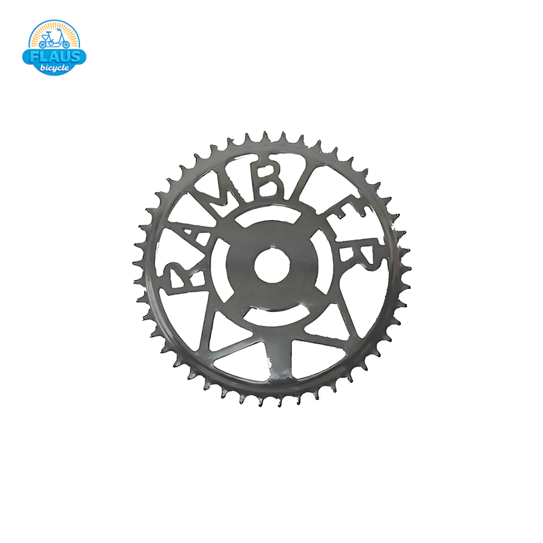 Coroa Rambler 46 dentes com letras recortadas e padrão estético clássico. Produzida pela Flaus Bicycle no Brasil, mantém o desenho original e encaixe fiel, sendo ideal para colecionadores e entusiastas de restauração histórica.